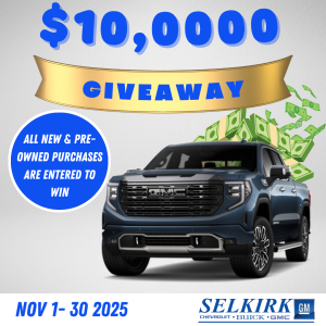 This November, your next vehicle purchase could come with a $10,000 bonus! From November 1st to November 30th, 2025, every new or pre-owned vehicle purchase at Selkirk GM automatically enters you for a chance to win $10,000 cash!
